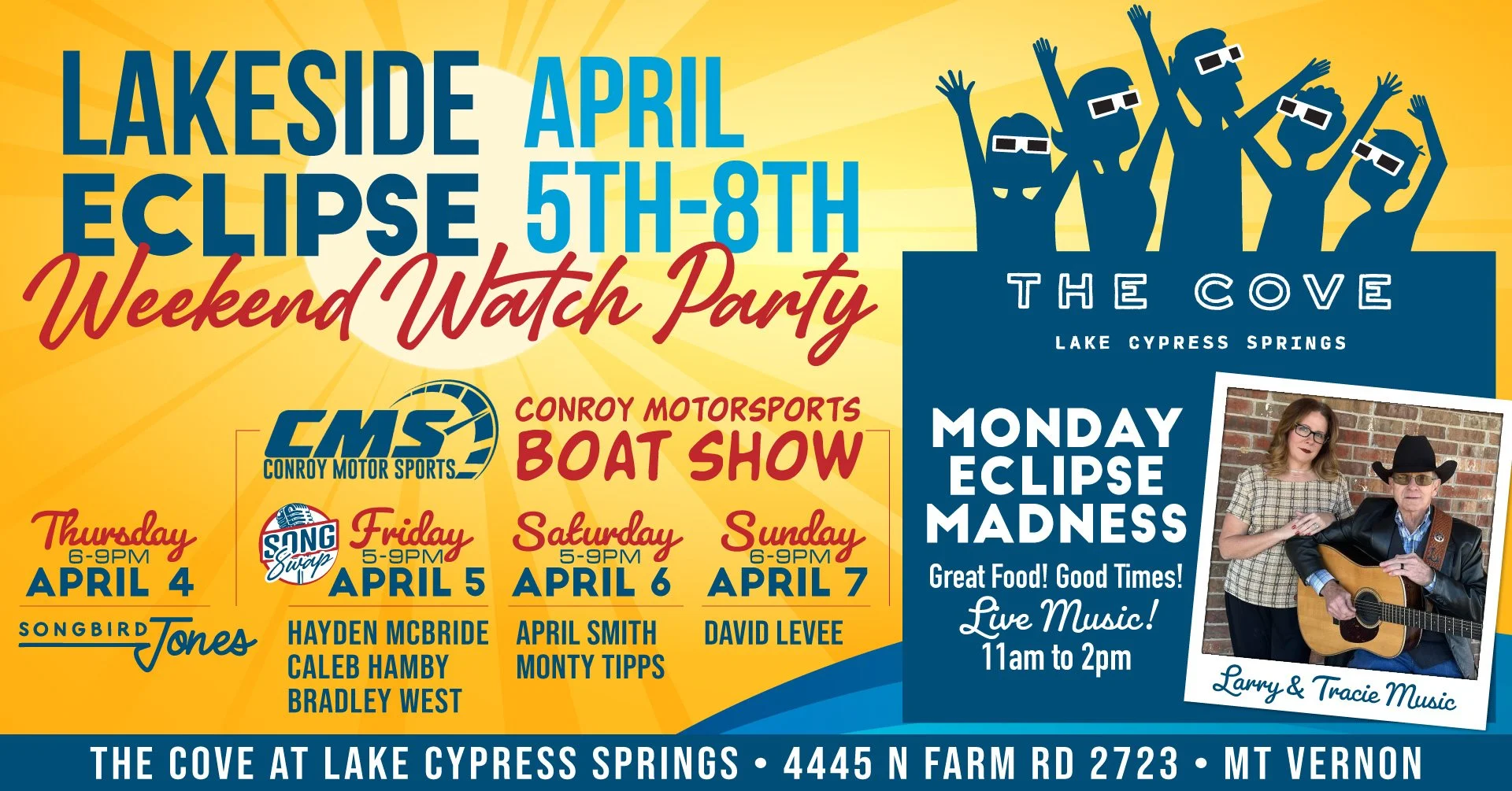 Lakeside Eclipse Weekend Watch Party Thursday, April 4, 2024 6:00 PM 18:00 Monday, April 8, 2024 3:00 PM 15:00 The Cove at Lake Cypress Springs 4445 North Farm Road 2723 Mount Vernon, TX, 75457 United States (map) Google Calendar ICS Visit Our Event Page on Facebook